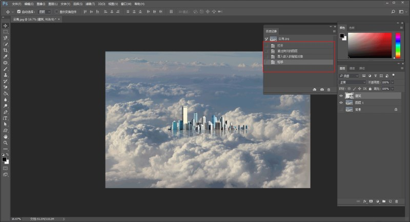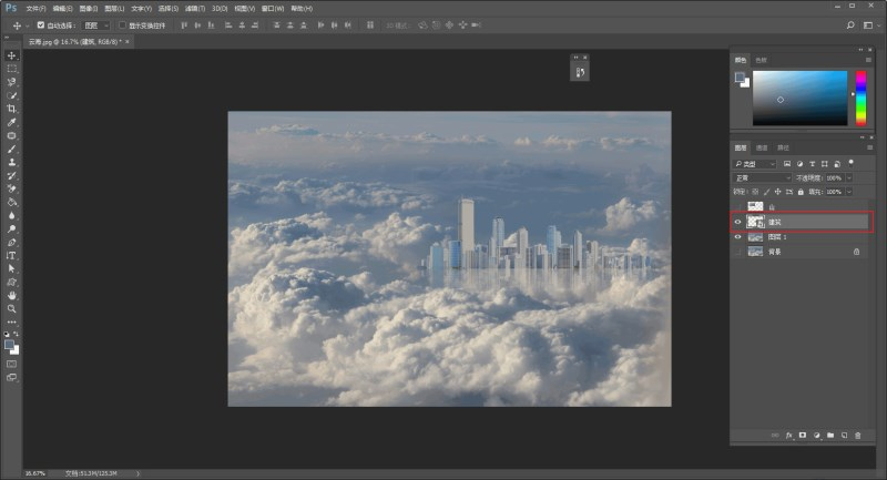 谈到合成,大家最发愁的莫过于把不同素材的色调调整成一致。 这里给大家分享一个小窍门,当然,相信也有不少同学知晓。那就是:匹配颜色。 以今天的内容为例,大背景是云海,而楼房和山属于云海中的元素。所以我要把楼房和山的颜色调整得与云海一致。 具体步骤: 首先在 Bridge 中打开云海素材,按 ctrl + j 复制一层,接着把建筑拖进去: