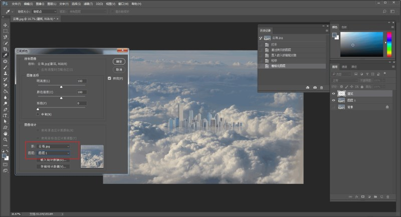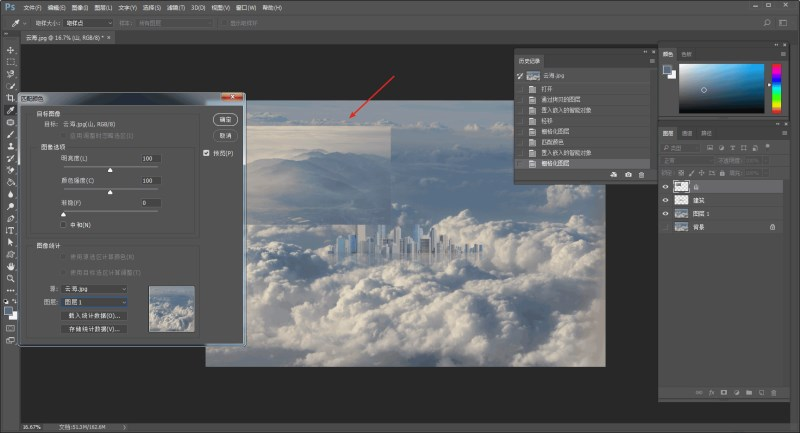 把“源”选为云海,图层选图层 1,这表示要把你所选图层匹配成图层 1 的色调,这样大家就能看到建筑的色调和背景图层很相近了: