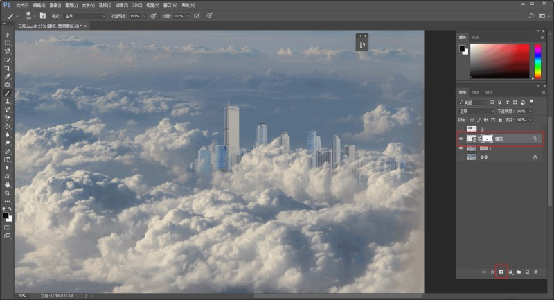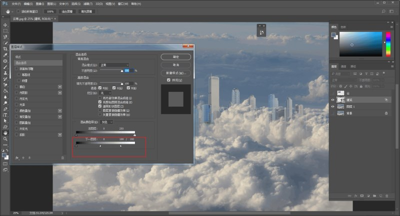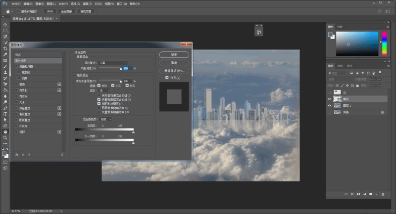 我想做出云朵在建筑中穿插的效果,所以双击建筑图层,调出图层样式: