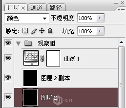 2、创建观察组 在图层最上方新建组1,命名成“观察组”。 在组内创建图层并填充黑色,将图层模式改为“颜色” 复制一个图层,把图层模式改为“叠加” 要是图层叠加之后效果过黑,可降低叠加模式图层的不透明度 最后再用曲线增强下对比