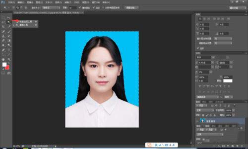 接着在左边工具栏点击魔棒工具,选择“快速选择工具”,然后点击照片的蓝色背景部分,将蓝色背景框选出来。