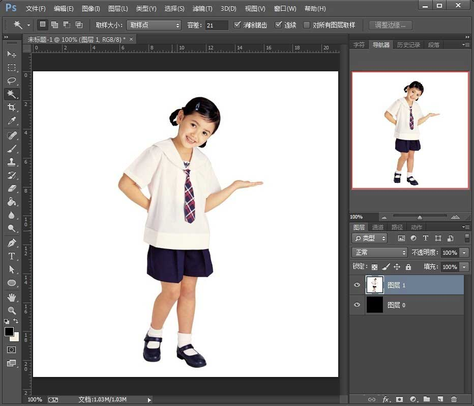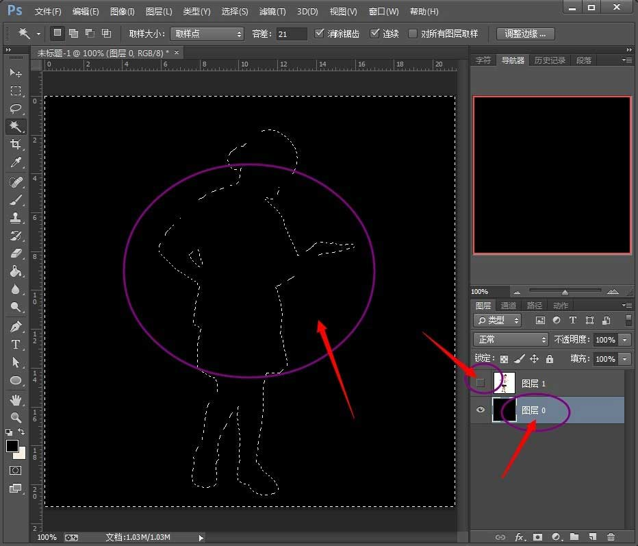 5、这时按下键盘的【del】键,在背景层状态下,删除选中的区域。鼠标点击一下空白处,取消【魔术棒】的选中状态。此时便得到一个纯黑色剪影。