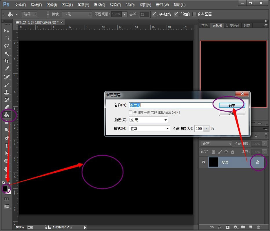 具体步骤: 1、开启Photoshop软件(以下简称PS),运用【油漆筒】工具,将背景设定为纯黑色。双击背景图层,解除该图层的锁定。